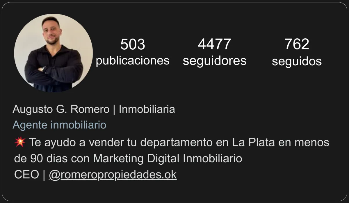 Augusto pasó de depender exclusivamente de referidos, lo cual le generaba un gran desgaste, a implementar una estrategia de contenido que le permitió ganar autoridad en su zona ( La Plata ), logrando captar propiedades de buen ticket y transformar su negocio, generando un crecimiento significativo y rápido.